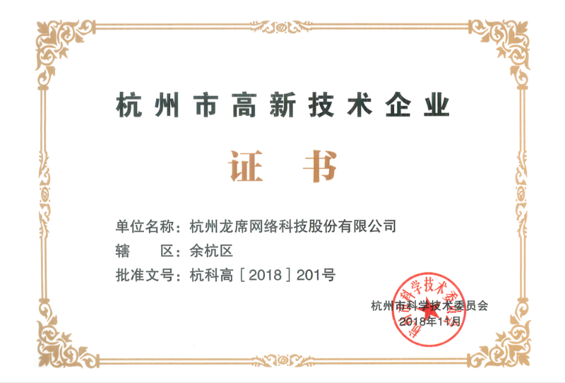 公司先后被評為杭州市雛鷹企業、軟件企業、浙江省科技型中小企業、國家科技型中小企業、杭州市高新技術企業、國家高新技術企業、